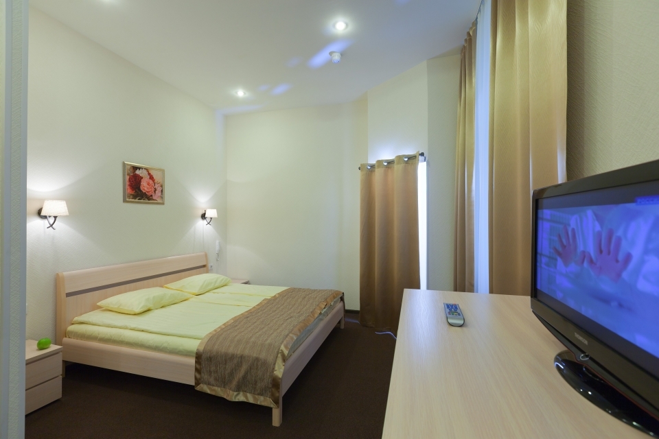 В номере: кровать, шкаф, стол, кресло, стулья, тумбочка, зеркало, телевизор, телефон, холодильник