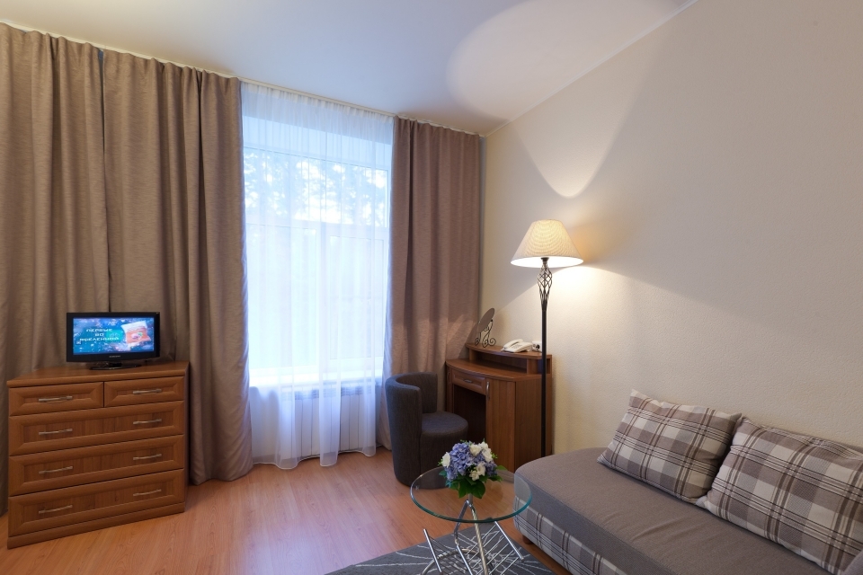 Описание: просторный однокомнатный номер для размещения одного человека или семьи. По комфортности это номер класса "Люкс", отличие состоит в том, что он не разделен на 2 помещения (гостиная и спальня). Места для сна, отдыха, чаепития выделены при помощи зонирования.