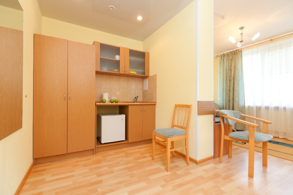 Описание: Аккуратный, удобный, функциональный номер на 2 человек. Номер состоит из гостиной с выделенной спальной зоной, мини-кухни (в некоторых номерах) и ванной комнаты.